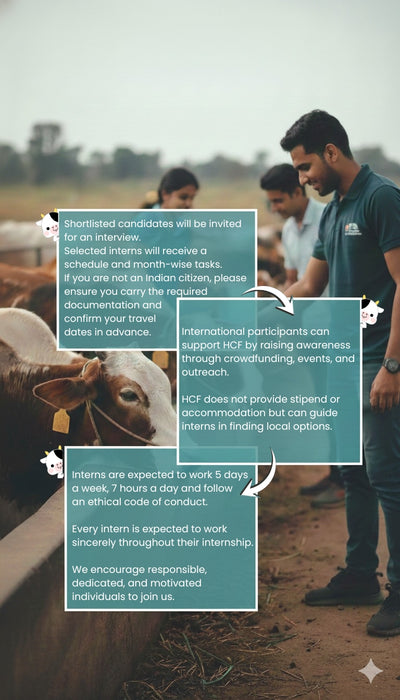 HCF is steadily expanding its mission of building sustainable shelters for cattle across India. Creating these protected environments requires dedicated hands, compassionate hearts, and people willing to contribute their skills and time. Volunteers and interns play a crucial role in strengthening our animal welfare initiatives, setting up new shelters, and supporting villages that urgently need structured guidance. Join HCF in spreading awareness, supporting shelter projects, and helping us build more sustainable animal farms and Gaushalas across the country with your unique contribution.